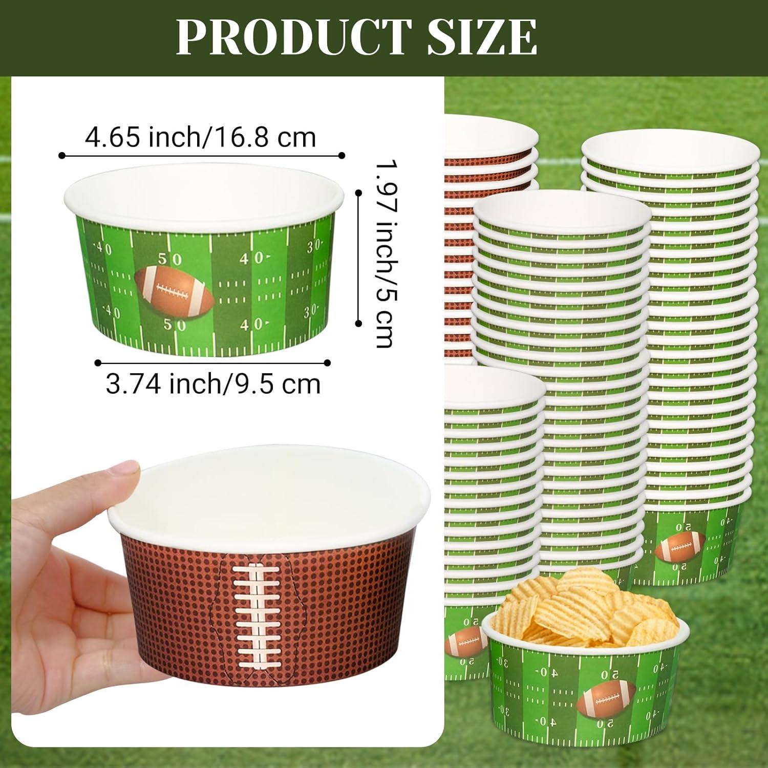 HIGH QUALITY – Our football snack bowls are made of quality paper material, sturdy and lightweight, durable and convenient, not easy to fade or break, with the edge rolled and bottom hardened, holding hot or cold food, you can use it with confidence.