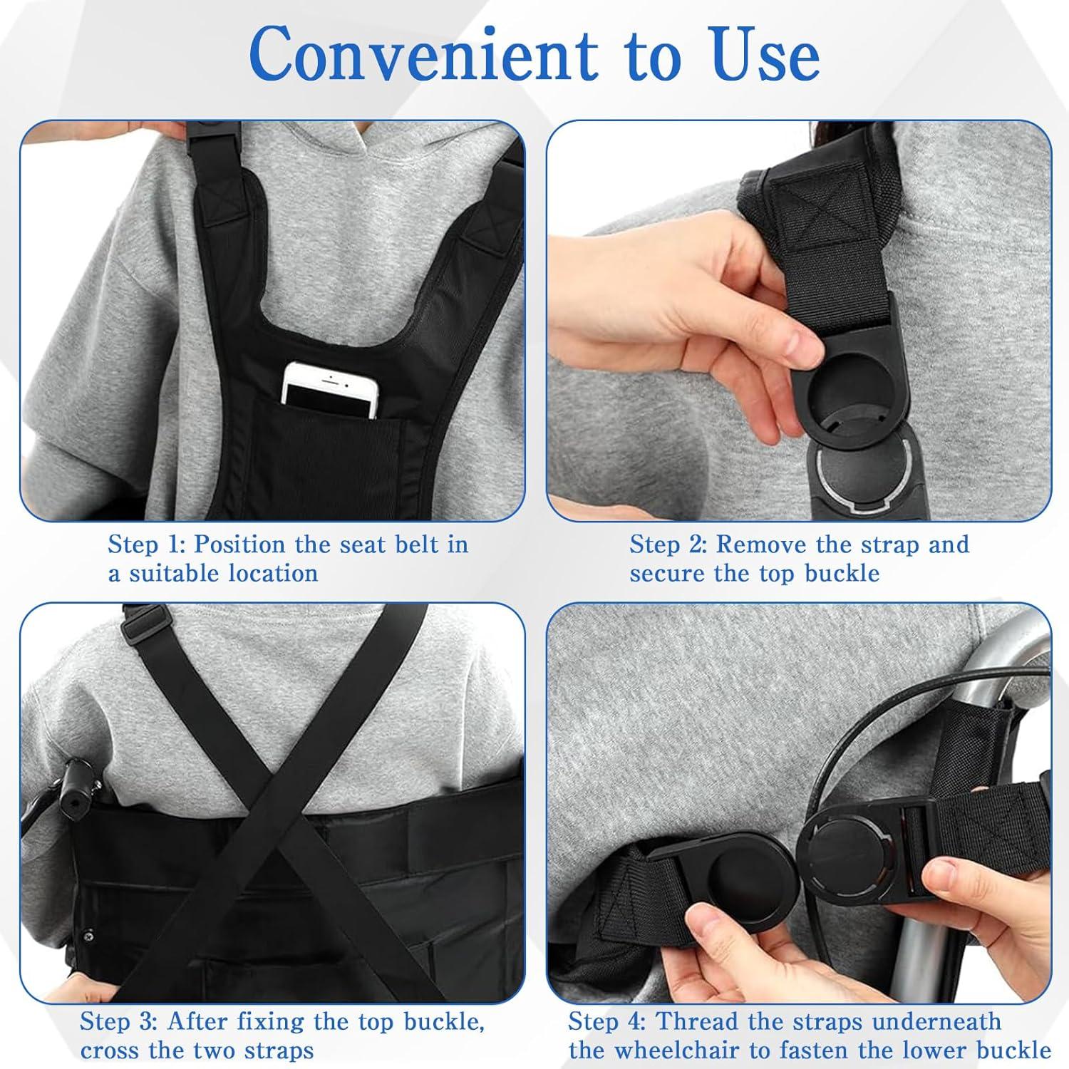 Easy to Wear: The wheelchair seat belts for adults adopt universal round buckles, making it easy to wear and adjust; simply wear the wheelchair seat belt on the body, then buckle up and down, left and right straps, finally adjusting the wheelchair seat belt to the appropriate size as needed