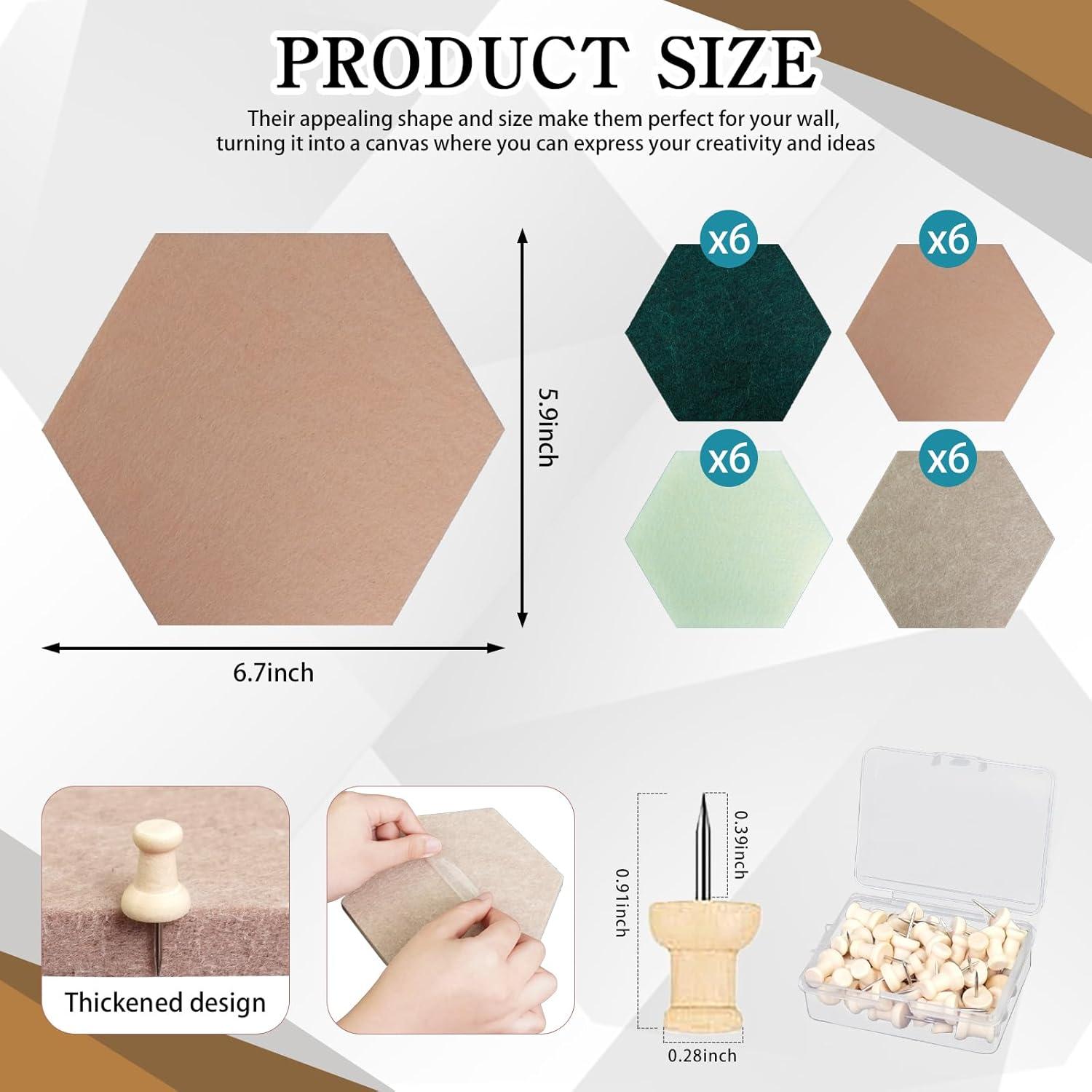 Ample Quantity: Each kit of the hexagon cork board tiles includes 24 individual boards, a box of wooden push pins, and a roll of double-sided tape for creating a personalized space with this hexagon cork board on your wall