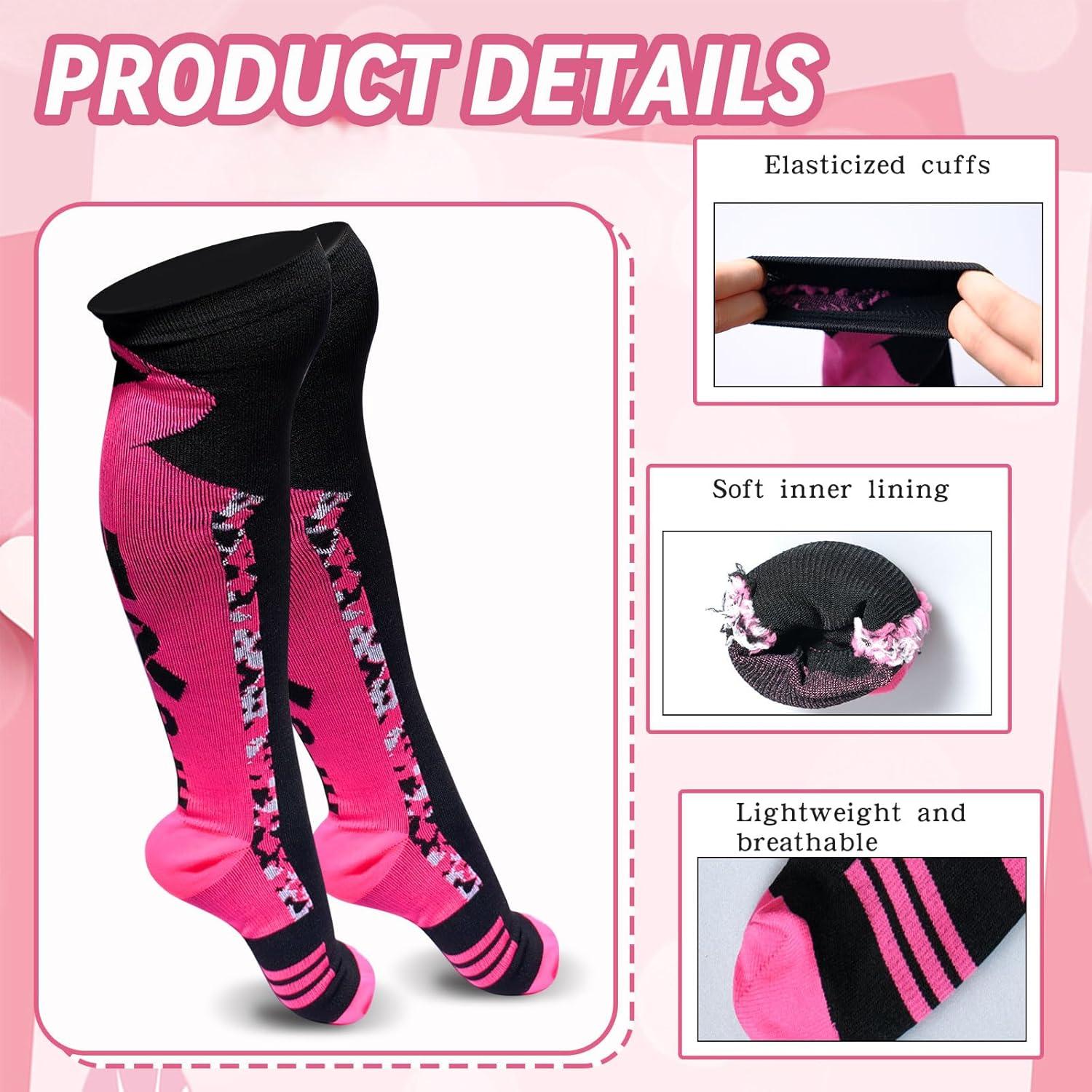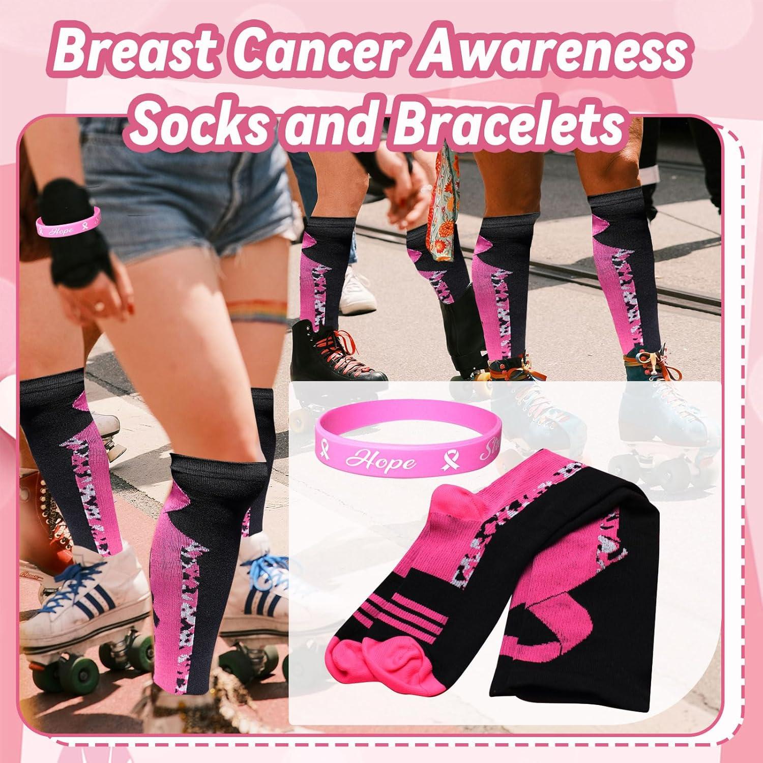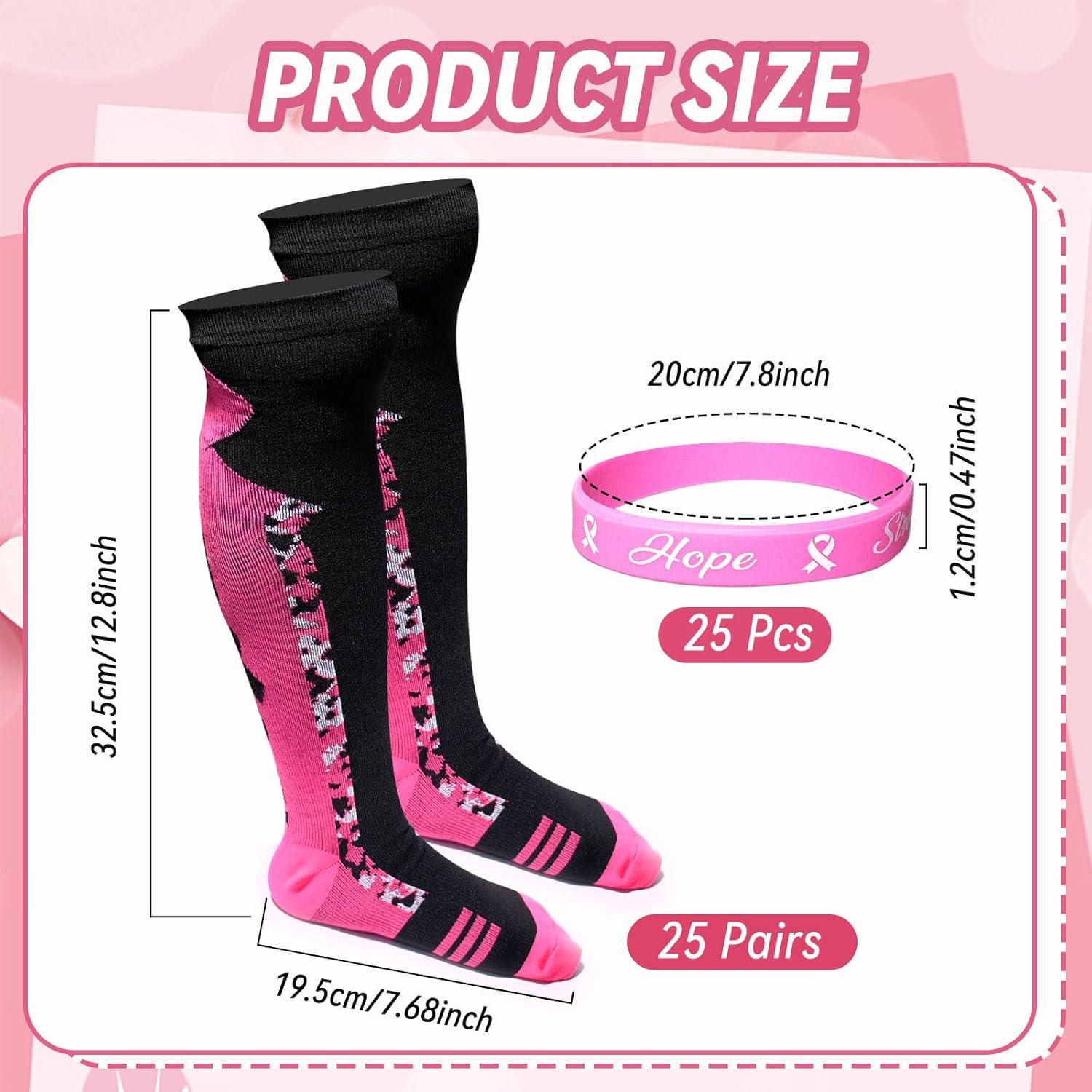 25 Pairs Breast Cancer Awareness Socks Pink Ribbon Calf Knee High Socks 25 Pcs Wristbands Softball Soccer Football for Women Men