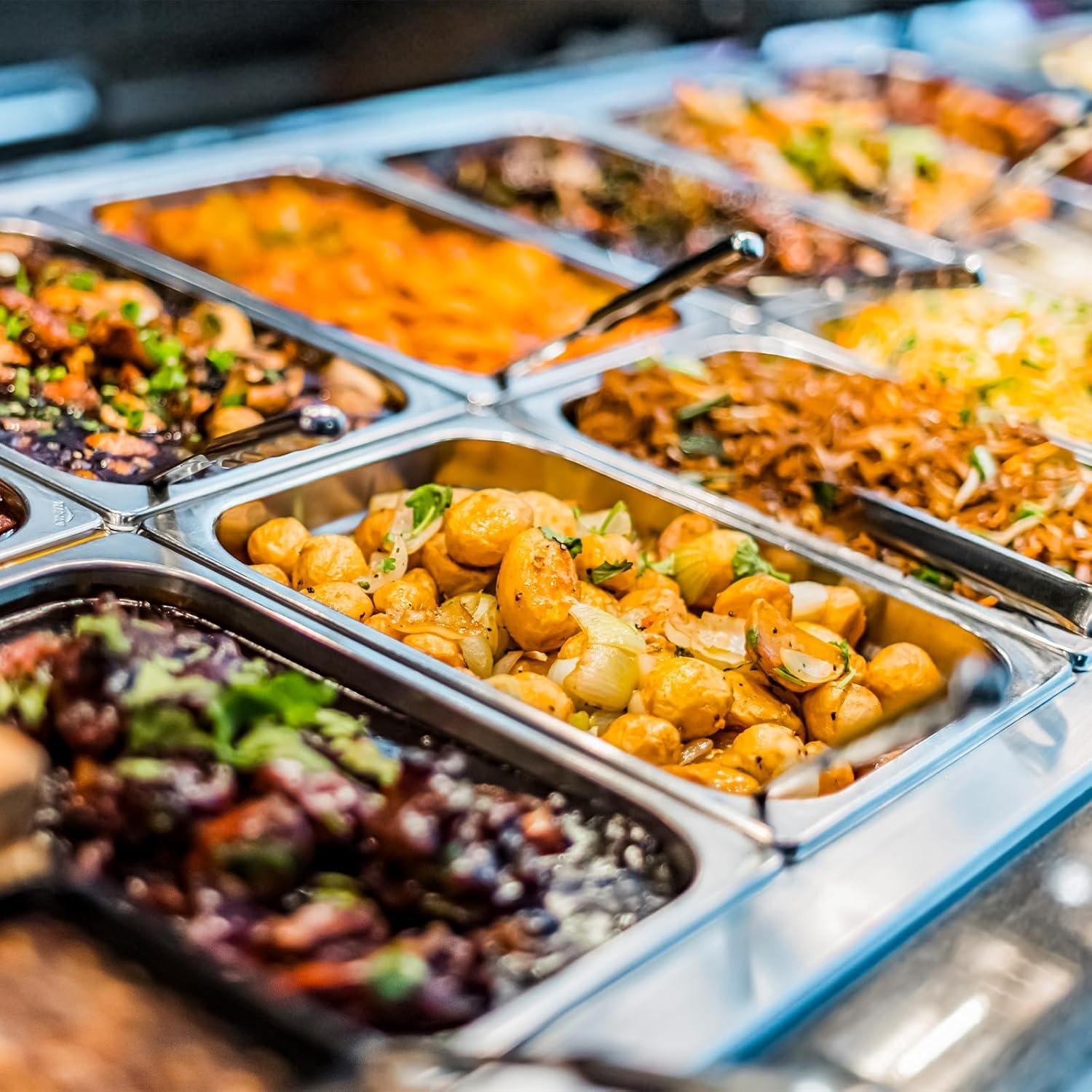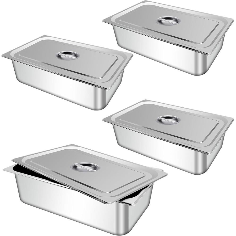 Generous Capacity and Stackable: These 4pcs 1/1 size stainless steam hotel pans with lids offer deep 6 inch compartments, which suit buffet or catering usage and are simple to clean, dishwasher compatible, and easy to store by stacking when not in use