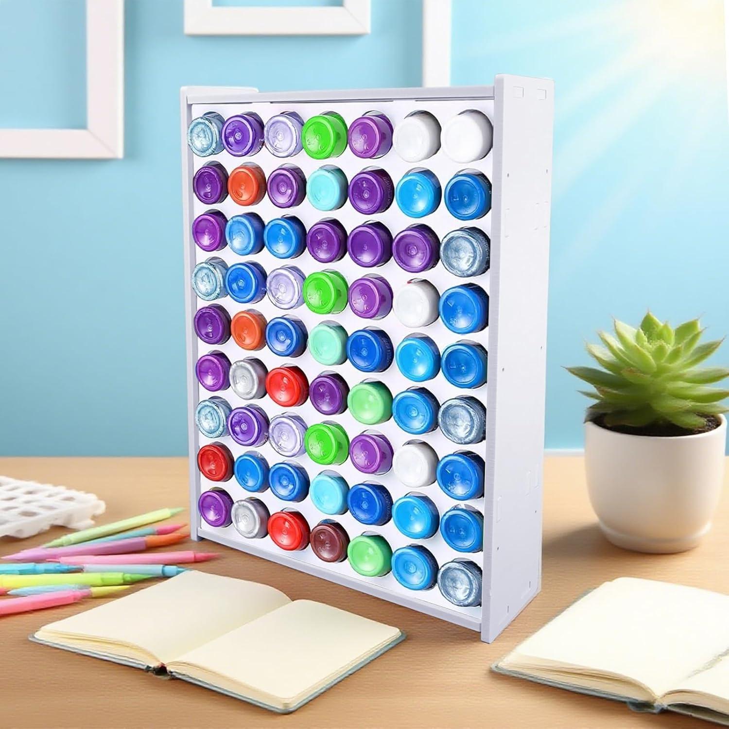 63 Holes for Vertical Paint Organization: Featuring 63 holes of about 1.5 inches / 3.8 cm diameter, the craft paint storage organizer serves as a vertical rack stand to hold 2 oz paint bottles, ensuring visible display and easy access